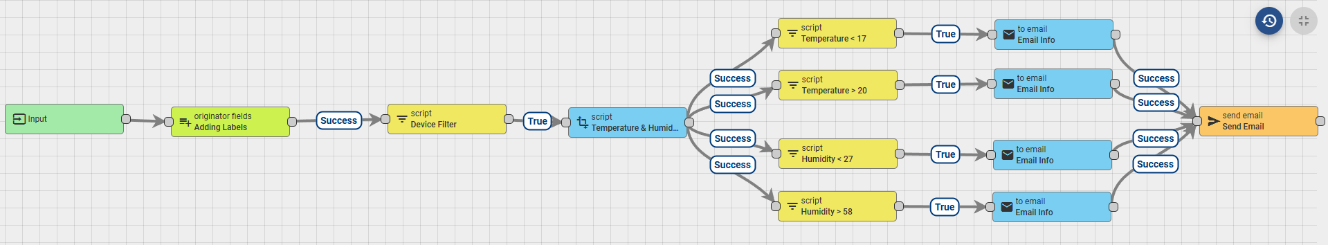 - Connection: Connect the Temperature & Humidity Formatting node to all your threshold filters using Success links.