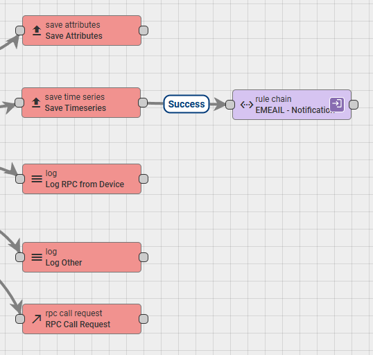 Here is how the connection in the Root Rule Chain should look: (The data will now successfully flow from the device, save to the database, and proceed to your custom email notification chain!)