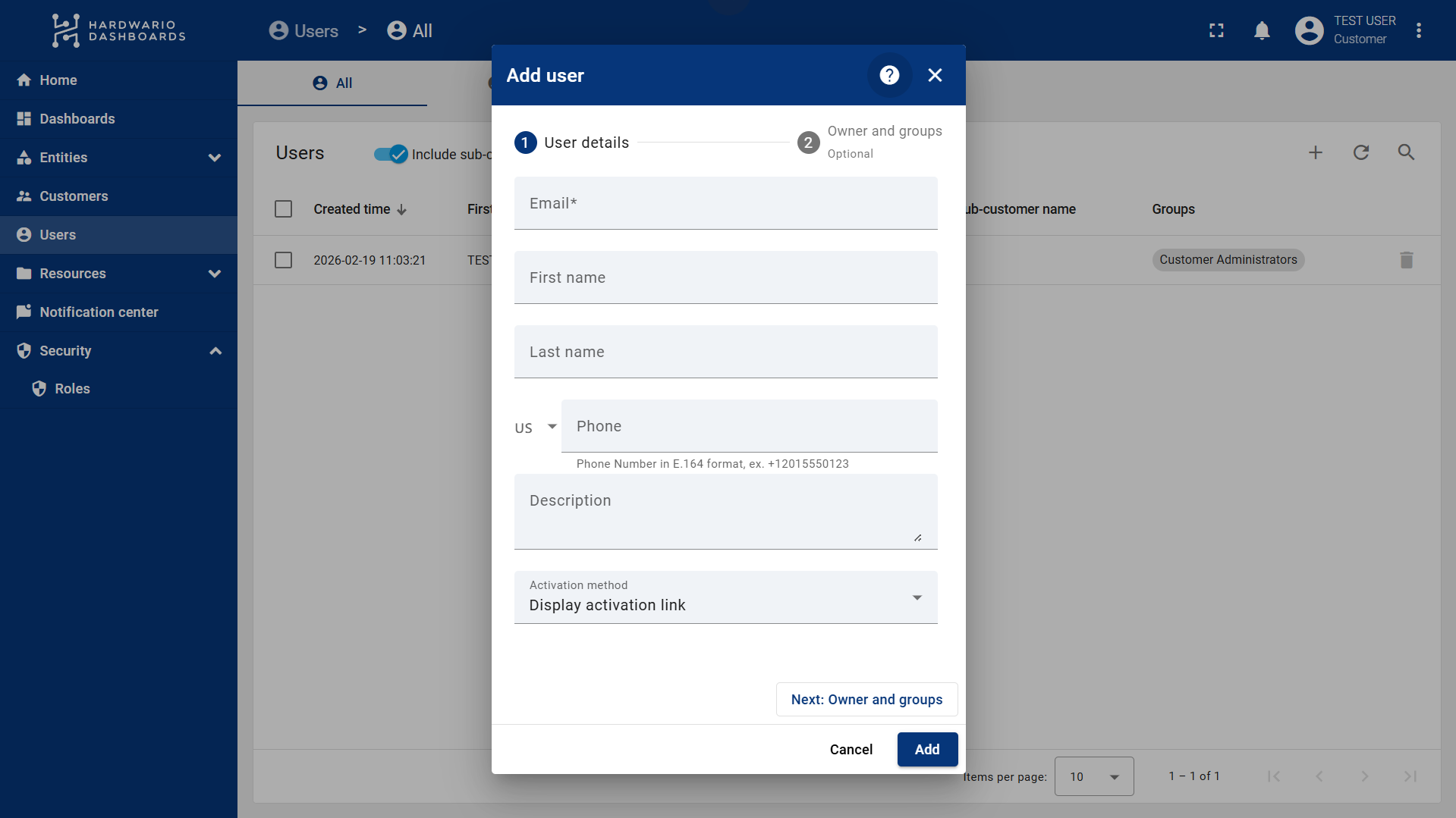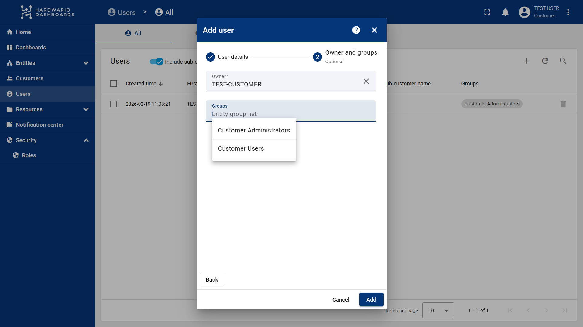 2. Select the Customer and the User Group the user will belong to.