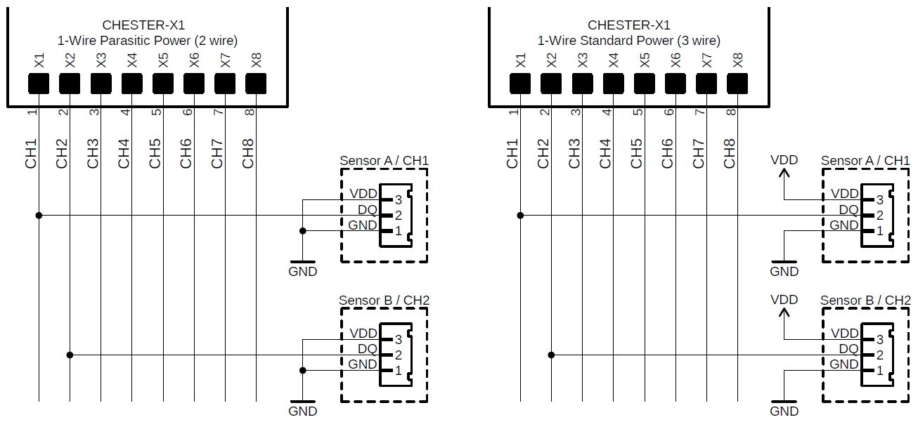 CHESTER-X1 provides 8 independent 1-Wire channels allowing to connect digital sensors ( e.g. Dallas DS18B20) or any other 1-Wire peripheries. The module implements Maxim DS2482S-800+ interface and also 5V boost converter to support 5V 1-Wire peripheries.