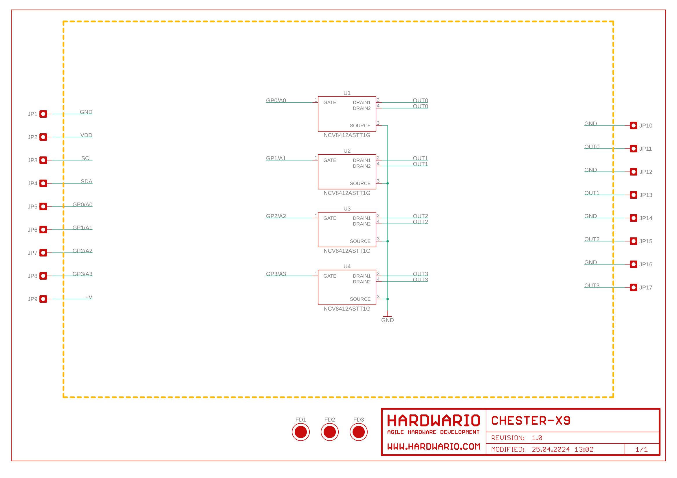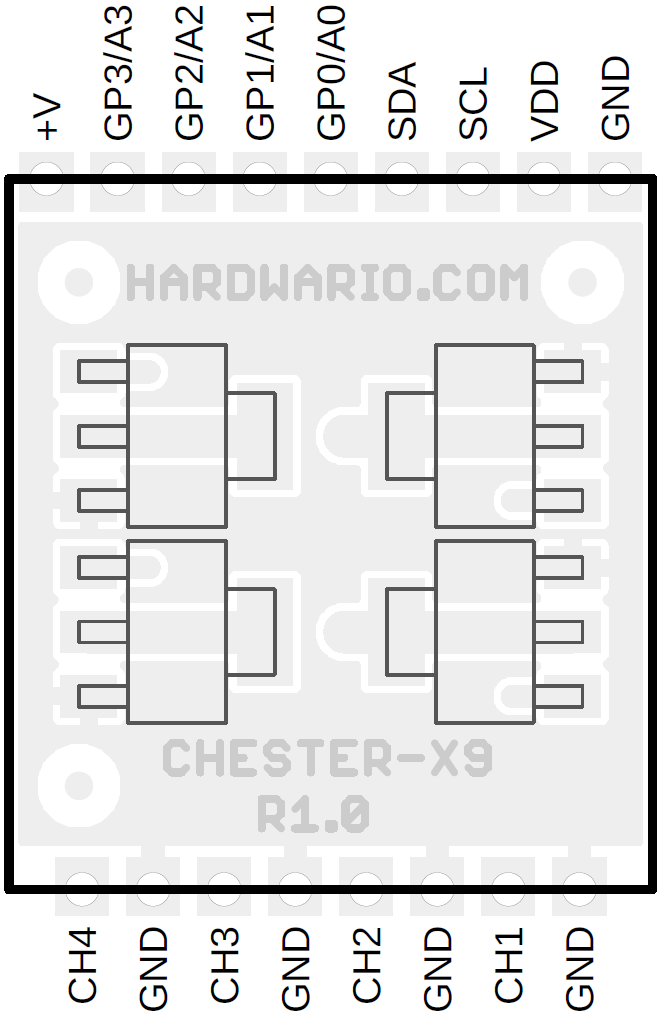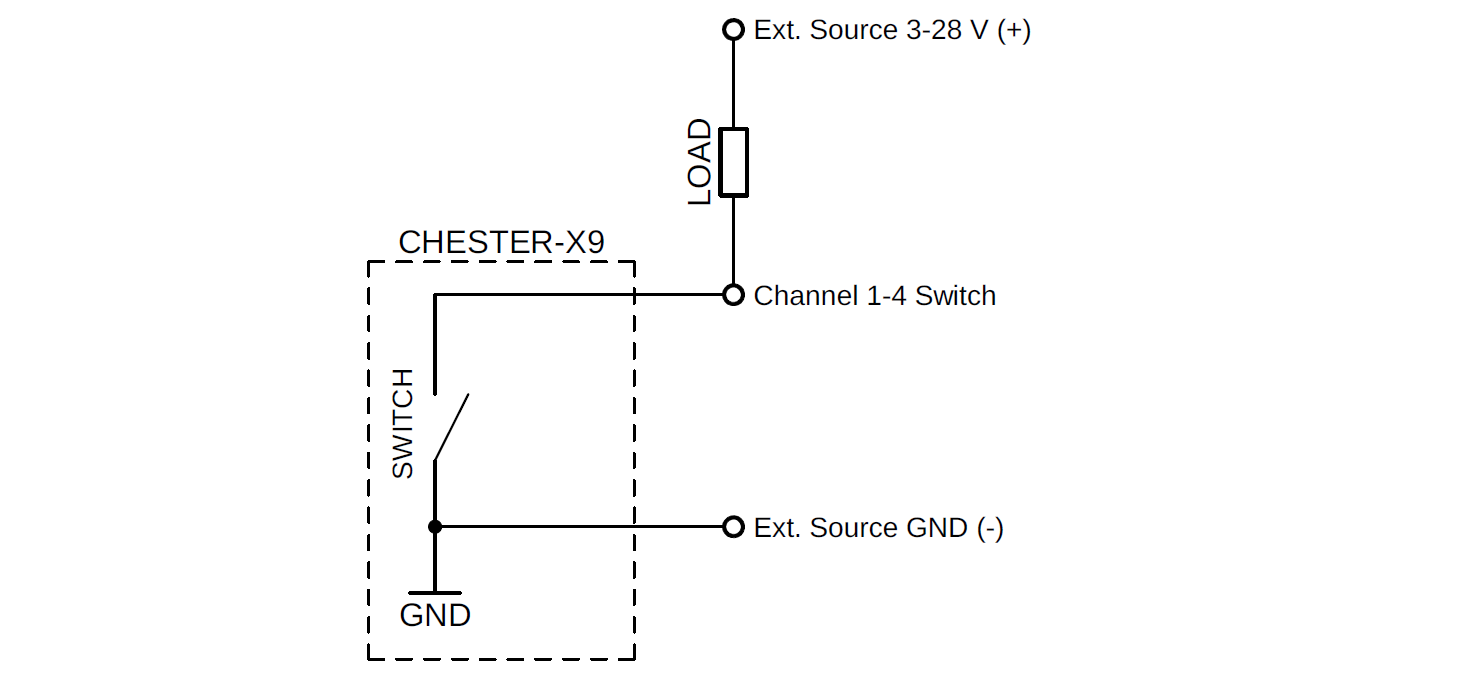 CHESTER-X9 provides 4 low side switches witch current limit capable to control the load from an external voltage source.