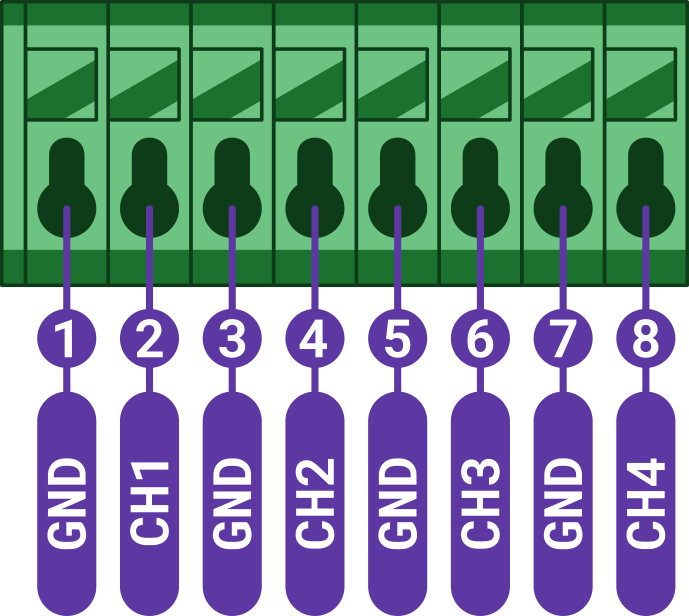 The load have to be connected between external voltage source and the low side switch output (channel 1-4) according to the diagram: