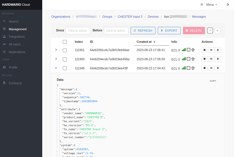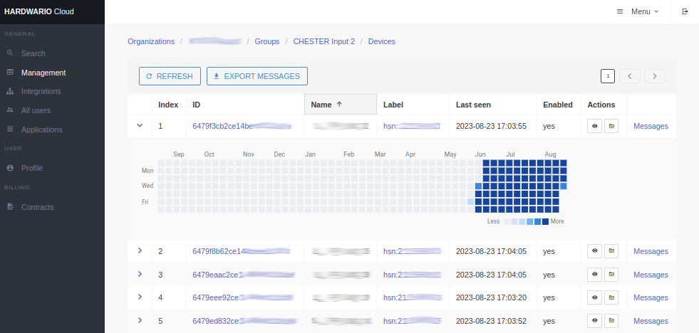 In the group, you can see all the devices. You can also use a handy visualization that shows how many messages devices sent every day.