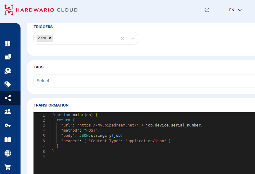 Every message passing through the Cloud is handled by a JavaScript. Users can add further logic or completely reformat JSON which is sent. In script, you can also access all the information from the device like name, tags and labels. You can change HTTP request headers, change URL or completely stop the callback.