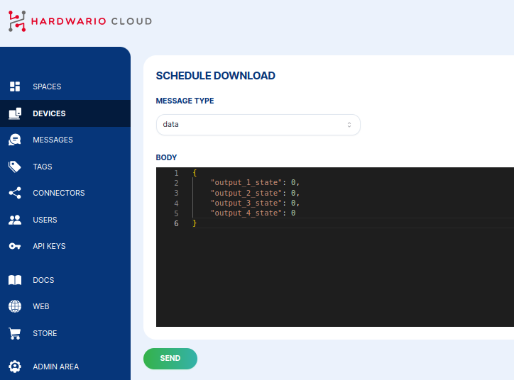 If you would like to send config or data from the web interface. Go to the device messages, in the top right corner click on + SCHEDULE DOWNLINK.