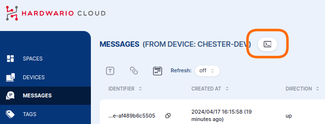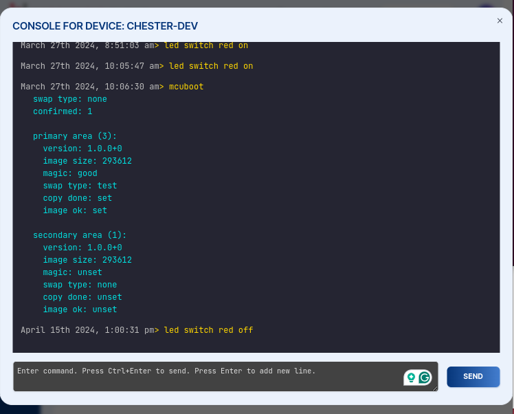 In the console, you can enter single or multiple commands that will be executed next time CHESTER will boot, send data or poll to the cloud. After that you will receive the response of every message and the response appears in the console. You don't need to keep the console window open. You can schedule commands and return later or the next day to see the results.